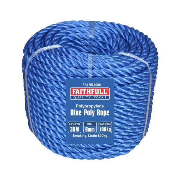 Faithfull FAIRB3080 Blue Poly Rope Coil 8mm Dia x 30M Max Load 100kg, Breaking Strain 800kg