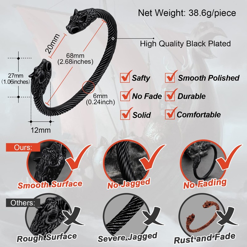 - 【Stainless Steel Bracelets】Inner Diameter: 68mm(2.68inch), thickness: 6mm(0.24inch), weight: 38.6g/piece, nice heavier and comfort fit design, a cool viking accessories to make you look more masculine & eye-catching!