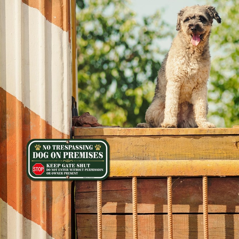 Faittoo No Trespassing Dog On Premises Keep Gate Shut Sign, 4 Pack 12 x 6 inch Rust Free Reflective Aluminum Dog Sign, Weather Resistant, Waterproof, Easy to Install