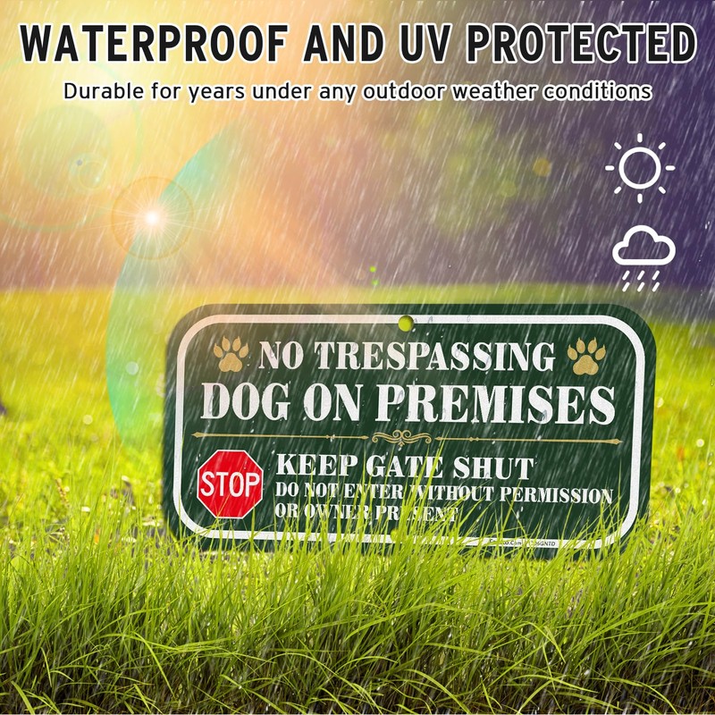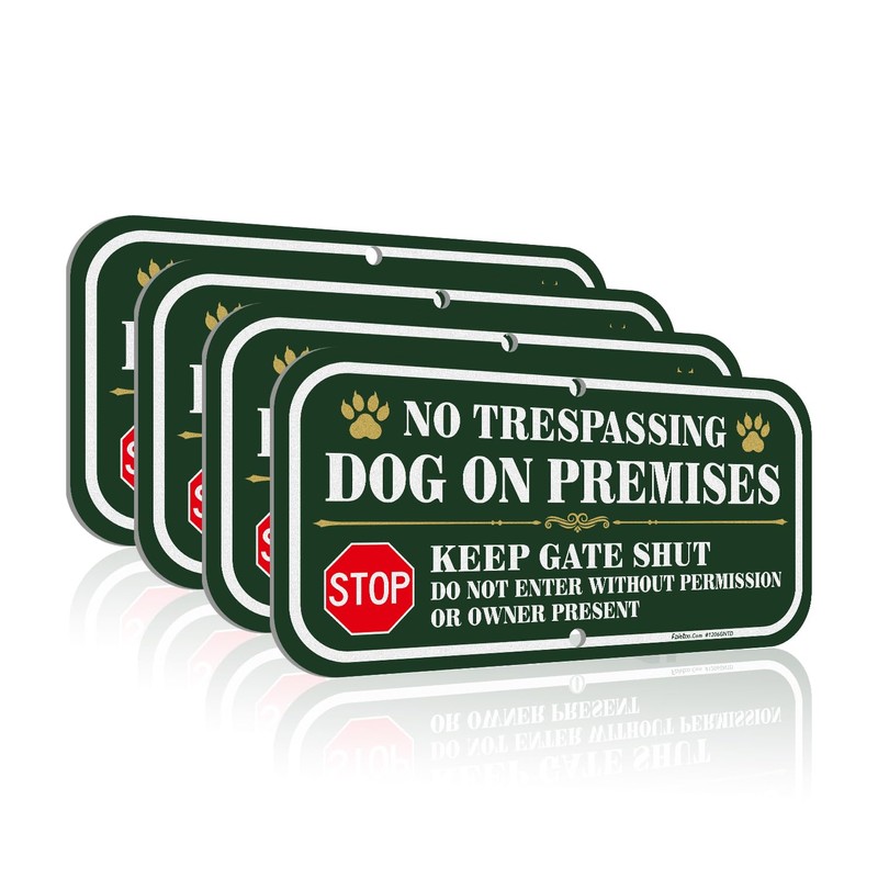 Faittoo No Trespassing Dog On Premises Keep Gate Shut Sign, 4 Pack 12 x 6 inch Rust Free Reflective Aluminum Dog Sign, Weather Resistant, Waterproof, Easy to Install