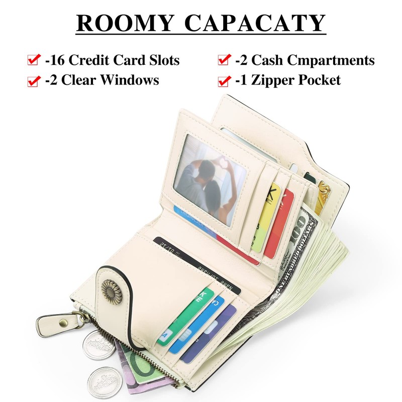 - Functional Design: This small wallets for women with 14 RFID blocking credit card slots, 2 clear Windows,1 zipper coin pocket for changes,coins and rings etc , 2 Full-Length Compartments;This womens wallet comfortable makes the perfect gift for any occasion like christmas, valentines, birthdays and anniversaries