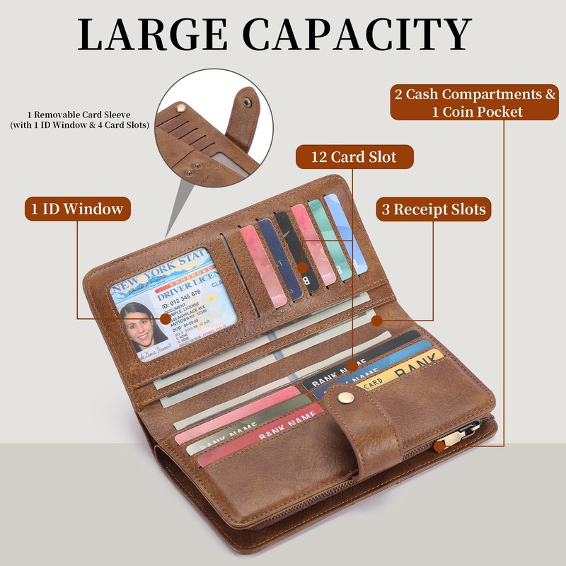 - Large capacity: This FALAN MULE wallet for women has 12 card slots, 1 ID window (inside), 1 detachable card slot with 6 card slots and 1 id window, 3 cash pockets, 1 large zipper pocket with 2 compartmentation, and an internal coin pocket with enough space to store your cards, cash, coins or your phone. Keep your belongings organized and fit for everyday life
