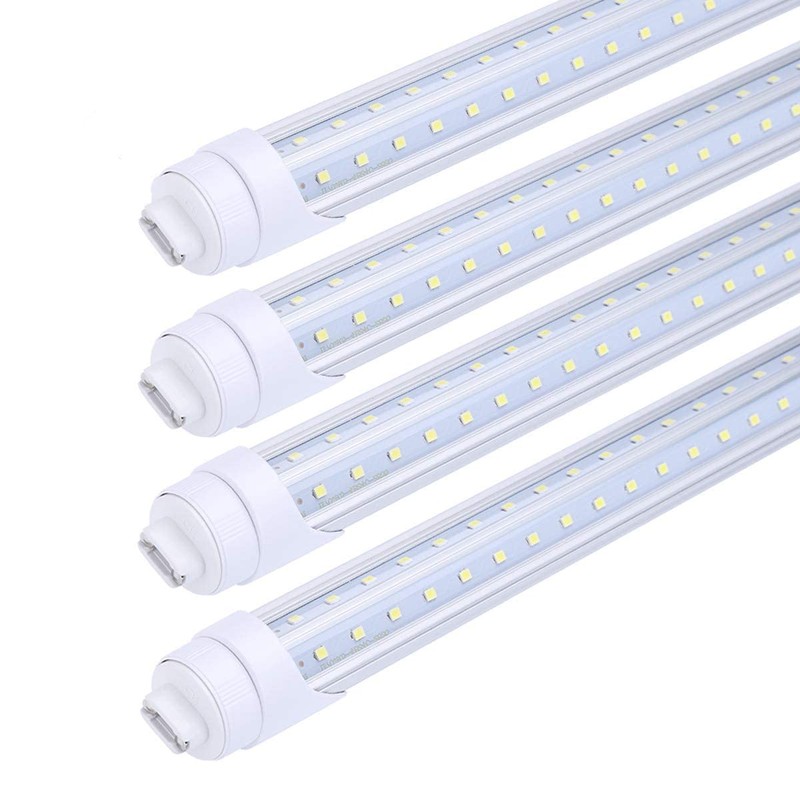 FALANFA 8ft R17D Rotatable HO Base led Tube Light 65W,270 Degree V Shaped LED Chip Bulbs,T8 6000K Cool White,Clear Cover,85V-265V,Dual-Ended Powered(Pack of 4