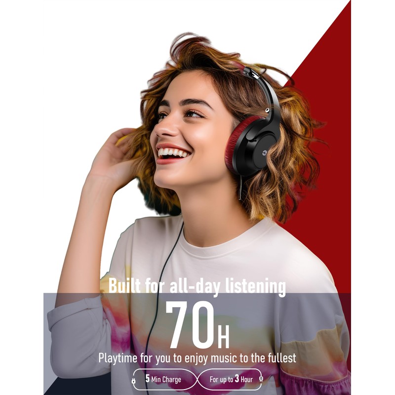 - [Enjoy Music] over ear headphones wireless provide over 70 hours of playtime with a built-in 600 mAh battery. The standby time is over 450 hours at full charge, and it comes with a 3.5 mm audio cable for switching to wired mode anytime, so you don’t have to worry about running out of battery