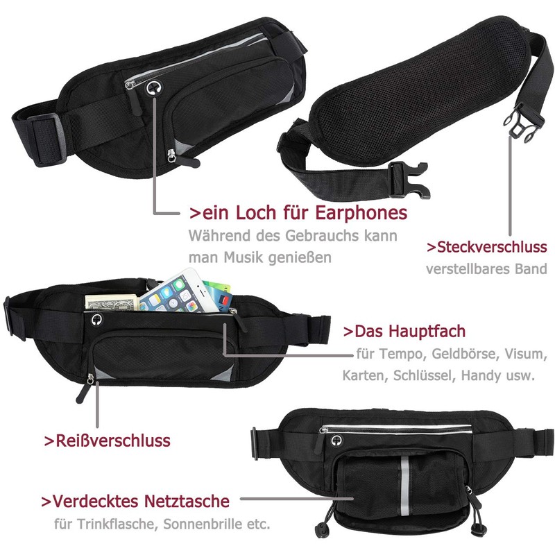- The size of the bum bag is 35 x 13 cm, you can put the mobile phone (under 7.2 inches) on the bag. There is a hole for earphones in the front of the belt bag, you can enjoy music during use.