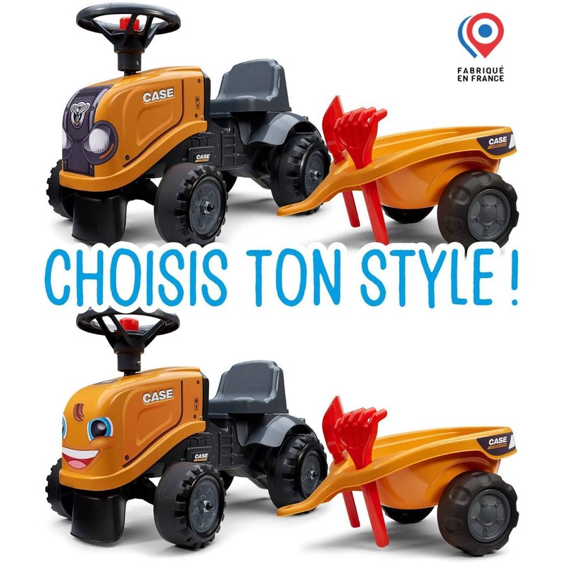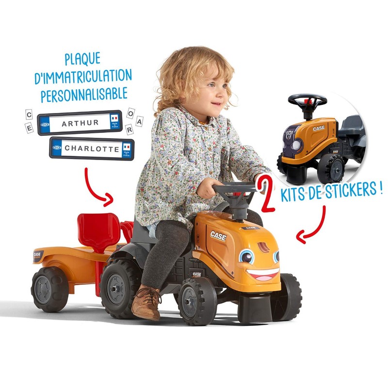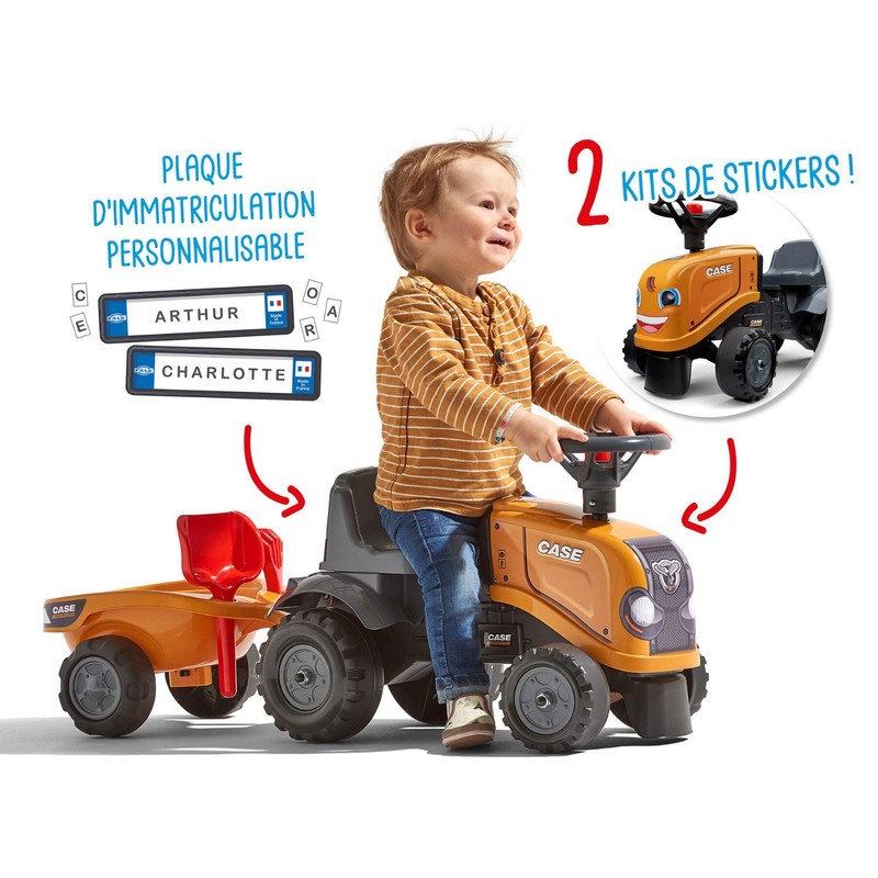 Case CE ride-on and push-along tractor equipped with a directional steering wheel with horn, and a mini trailer with shovel and rake. Including 2 customization kits and a customizable license plate - 100% made in France for little boys and girls, from 1.5 to 3 years to indoors and outdoor play.