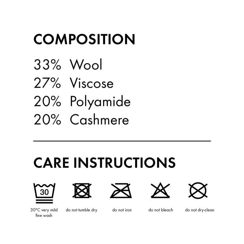 | Material Type: | 33% Wool, 27% Viscose, 20% Polyamide, 20% Cashmere |