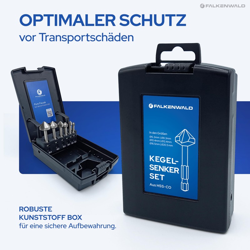 Falkenwald Countersink Set Made of HSS-CO Steel [6-Piece Including Storage Box] - Countersink Drill Wood Diameter 6.3 - 20.5 mm - Countersink Wood - Countersink Metal Countersink Metal