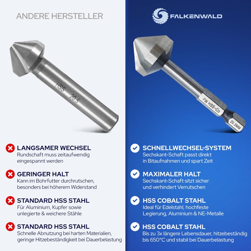 - Easy to use, clean and remove with precision - With their advanced 3-cutting technology, the countersinks allow particularly clean, burr-free results. Perfect for precise machining of drill holes in wood, metal and plastic.