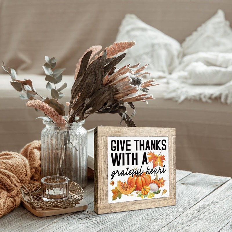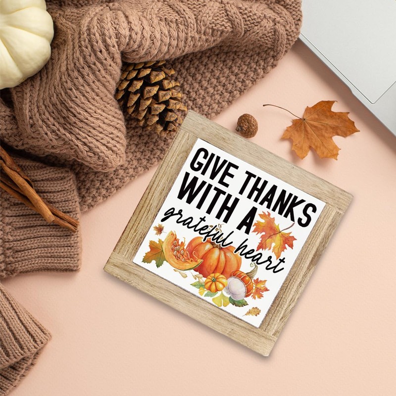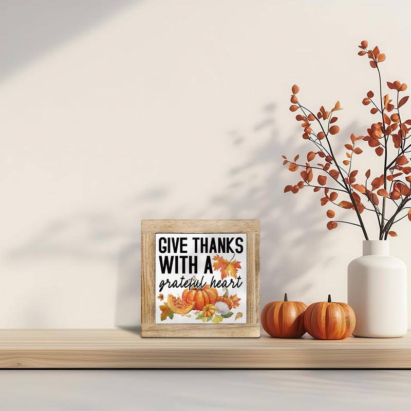 Fall Decor, Give Thanks with A Grateful Heart Signs, Pumpkin Harvest Decoration, Thanksgiving Home Farmhouse Decors, Wooden Decorative Fall Signs, Box Sign Wood Desk Sign Decor 5.9X5.9X0.7inches