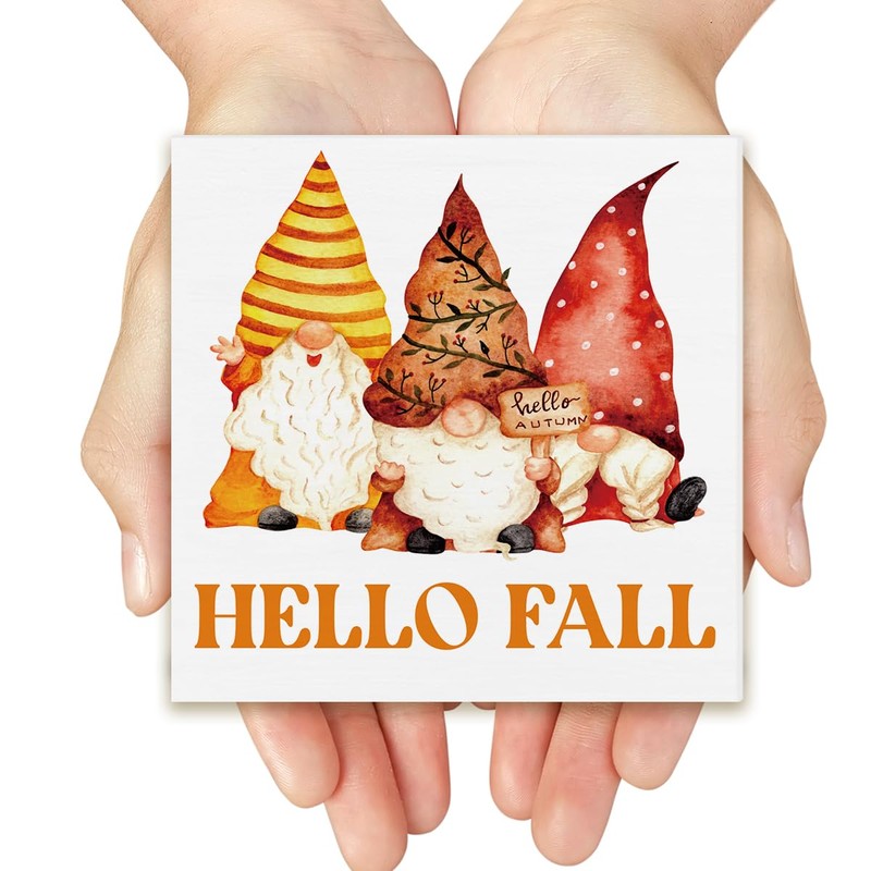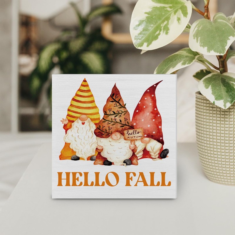 Fall Decor Hello Fall Wooden Box Sign Gnomes Fall Decorations Rustic Home Desk Shelf Tabletop Decor 5 x 5 Inches
