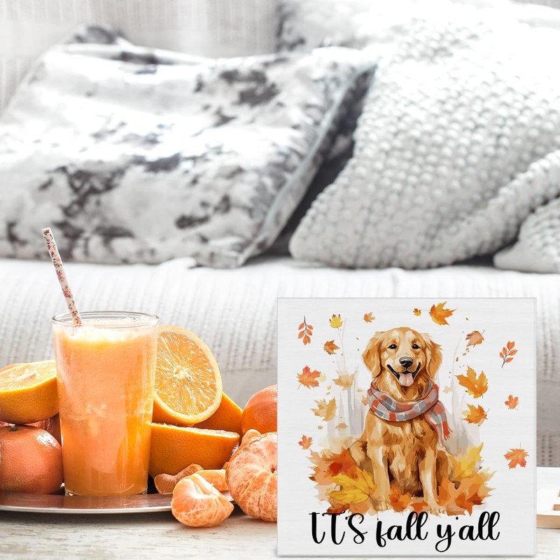 Fall Decor Maple Leaves Dog Wood Sign Rustic Autumn Decorations Farmhouse Home Table Desk Decor (5 x 5 Inches)