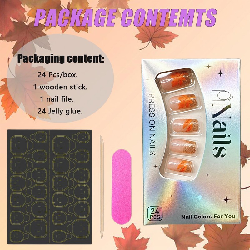 - Package Contains: You will get 24pcs autumn press on nails with maple leaf designs, 1pc nail file, 24pcs nail jelly stickers and 1pc wooden stick for removing false nails tips. No need to buy other things, you can get the nail salon-like effect