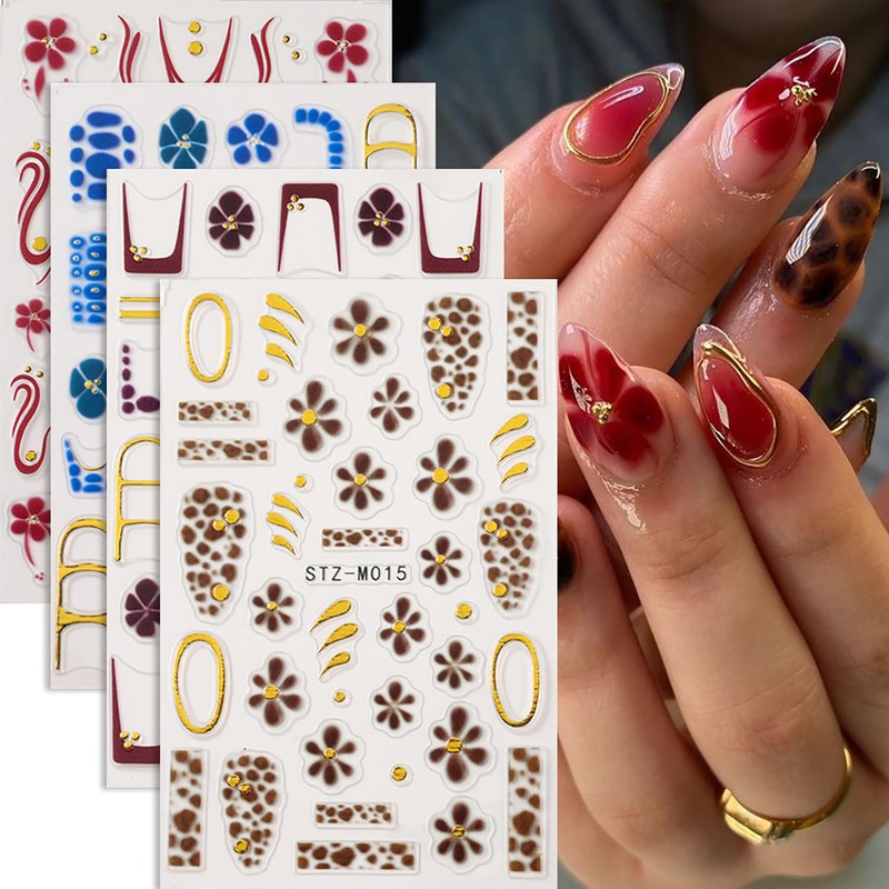 - Package Contain: You will receive 4 sheet of fall nail stickers red blue brown flower leopard nail designs stickers in 3.94×2.56in, catering to your rich imagination for daily nail DIY and uplifting your mood