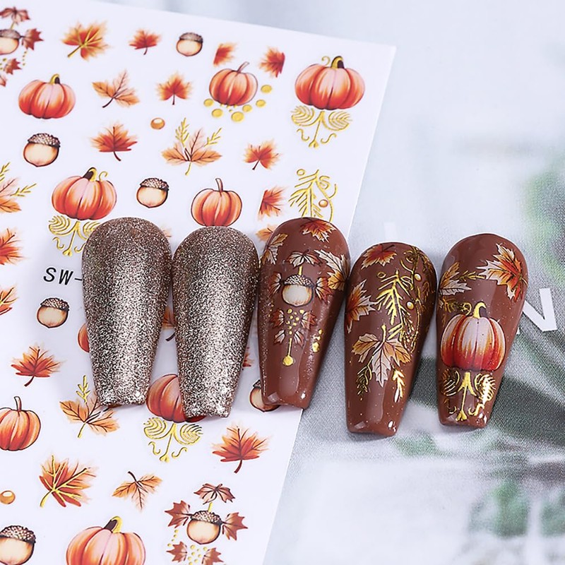 - Package Contain:You will get 6 sheets fall nail stickers large number of different patterns for you to use and replace in daily life. Fall Nail Stickers feature cute and spooky designs including pumpkins,maple leaves fruits.