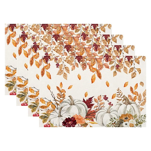 Fall Placemats Set of 4,Pumpkin Maple Leaf Floral Table Mats 12x18 Inch,Autum...