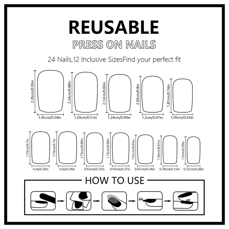 - CONVENIENCE: Reusable fake nails can help you save time while decorating your nails better. Change your favorite nail designs anytime, and in just a few minutes, you can use nail glue to stick these false nails onto your nails