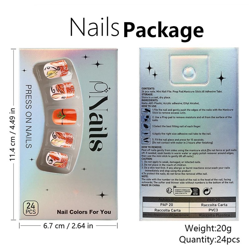 - 【Safe and durable】Fall square nails press ons is made of acrylic material, which is environmentally friendly, non-toxic, and odorless. They are durable and can be used for 1-2 weeks.