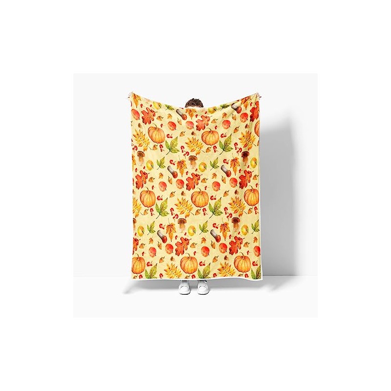 Fall Throw Blanket Pumpkin Blanket Thanksgiving Decor Soft Fleece Beige for Couch/Chair, Rustic Mushroom Berries Apples Acorns Autumn Leaves Cozy Soft Lightweight Throw Blankets