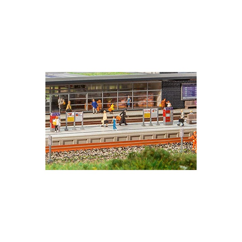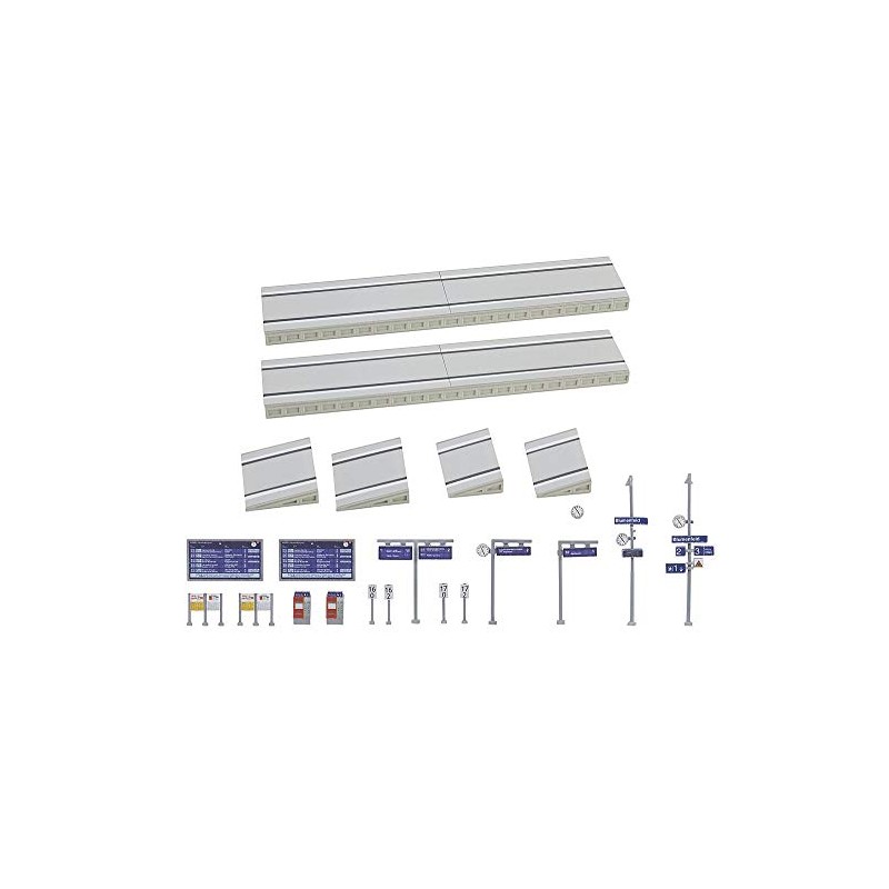 - Two platform plates printed with boundary lines with paving stone covering. For the platform ends, ramps with two different inclinations are included. Modern decorative elements, such as train destination indicators, ticket machines, lamps, information boards and signs are included in the kit. The platform width can be variably designed due to practical predetermined breaking points.