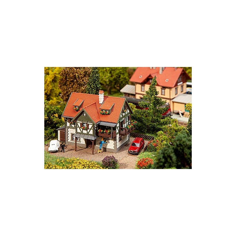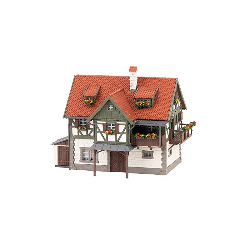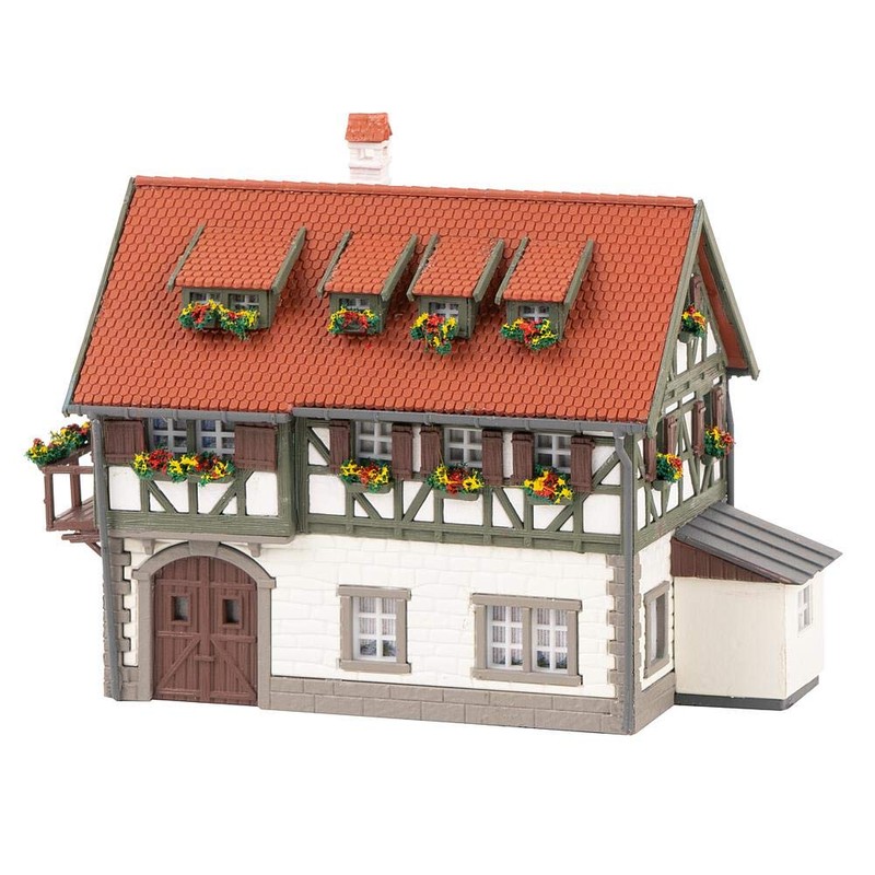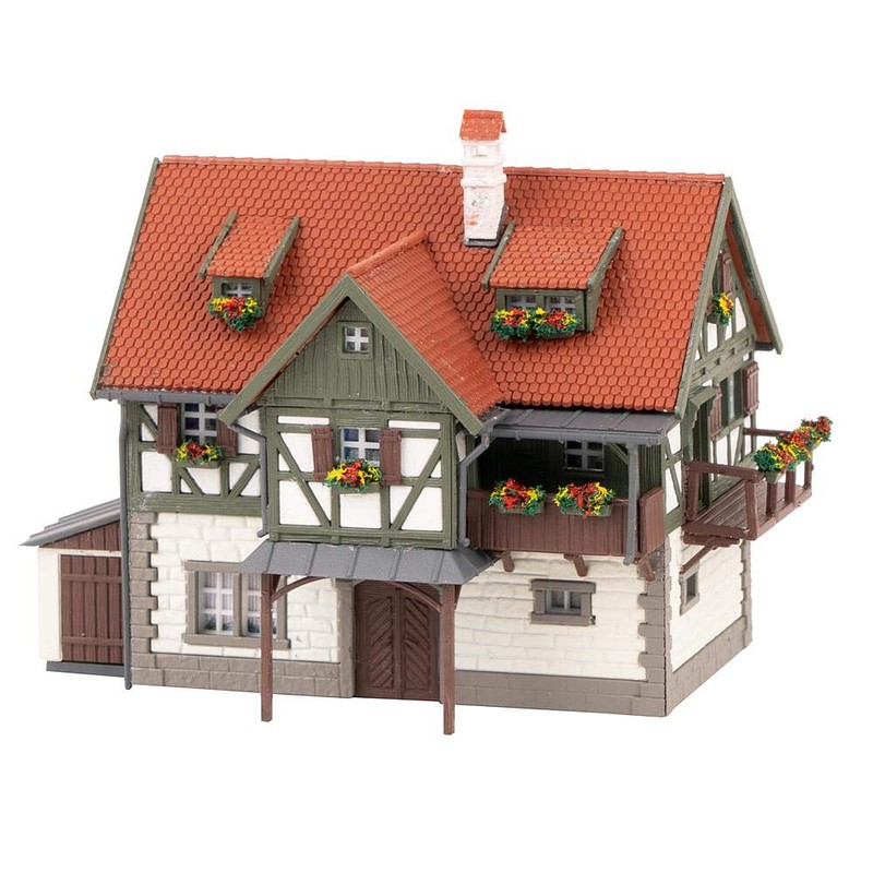 - Rural, two-storey forestry office building with half-timbered top, dormer roof and third gable. A shed extension, a wooden balcony, a dog house and flower boxes contribute to the versatile design of the model.