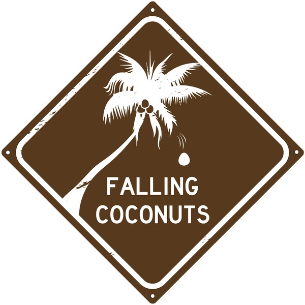 - Brown warning bar accessory features a coconut tree and reads Falling Coconuts with vintage distress markings for a retro look