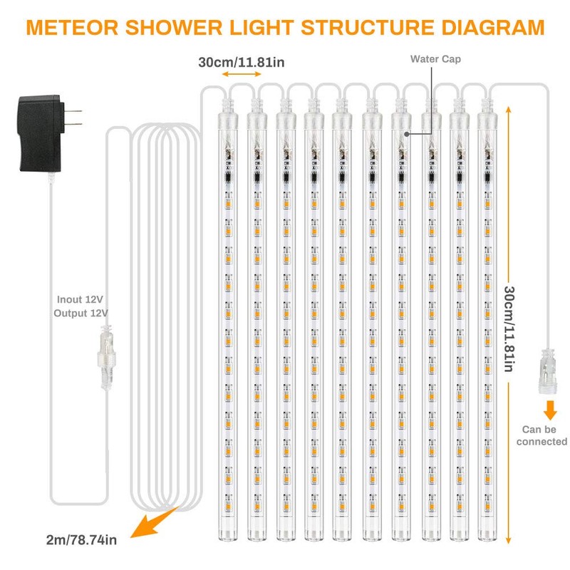 **Jhua meteor lights made of high quality PC and acrylic, waterproof, shatter- resistant and durable. Adopts superior printed circuit board, automatic dynamic transformation, gorgeous meteor shower effect. Pure light color, no flicker, no heat radiation, energy saving and environmentally friendly. Easy to install, ideal hanging decoration lamp for bar, garden, courtyard, garden square, pedestrian street, etc.** **Features:** ● Made of high quality PC and acrylic, integrated body, great waterproof and shatter-resistant property, durable in use. ● Super bright warm light, good heat dissipation effect, not dazzling, no flicker, no radiation. ● Adopts superior printed circuit board, automatic dynamic transformation, integrated circuit program makes the lights look like shooting stars. can provide you with the gorgeous effect of meteor shower. ● Falling rain lights provide 360 degree shining angles, low power consumption, energy saving and environmentally friendly. ● Perfect for decorating bar, garden, courtyard, disco hall, hotel lobby, garden square, pedestrian street, song and dance hall, etc. **Specifications:** Light Color: Warm White Material: PC, Acrylic LED Quantity: 192 LEDs Power: 2-4W Working Voltage: 110V-220V Plug Type: US Waterproof Level: IP65 Single Light Bar Length: 30cm/11.8inch Total Length: 320cm/10.5ft Weight: 259g/0.57lbs **Package Include:** 1 x Falling Raindrop Lights **Welcome to Jhua store, may you have a pleasant shopping experience! If you have any problems about our products, please feel free to contact us at any time !**