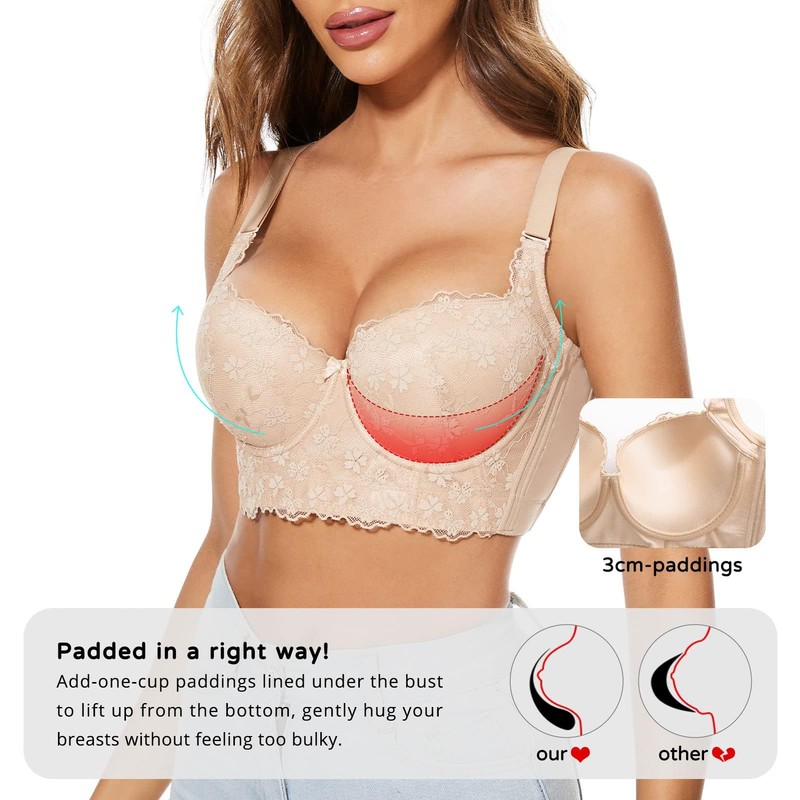 - Lace bustier bra with add-one-cup-size padding offers extra volumes in the cups to enhance your cleavage and outline a nice shape.