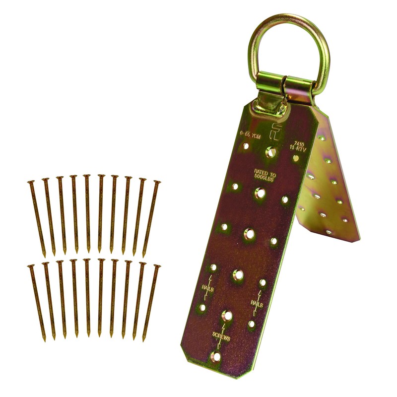 - Heavy-duty alloy steel plates and D-ring^Reusable when attached with screws^Holes marked for use with either nails or screws^Hinged design conforms to most roof peaks