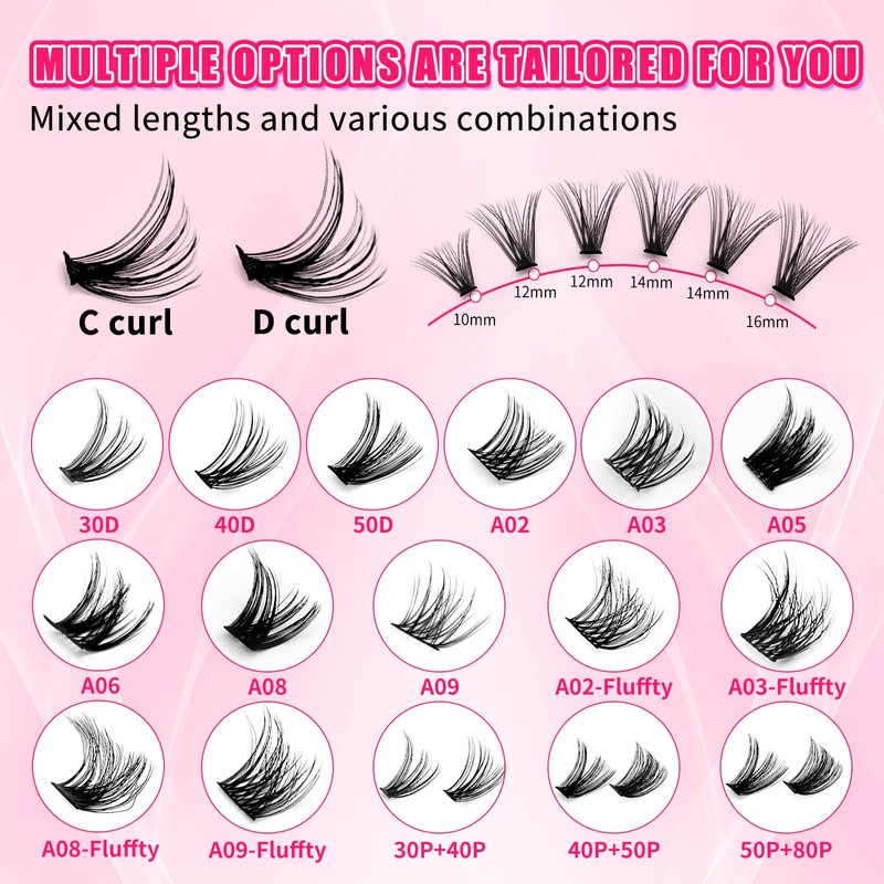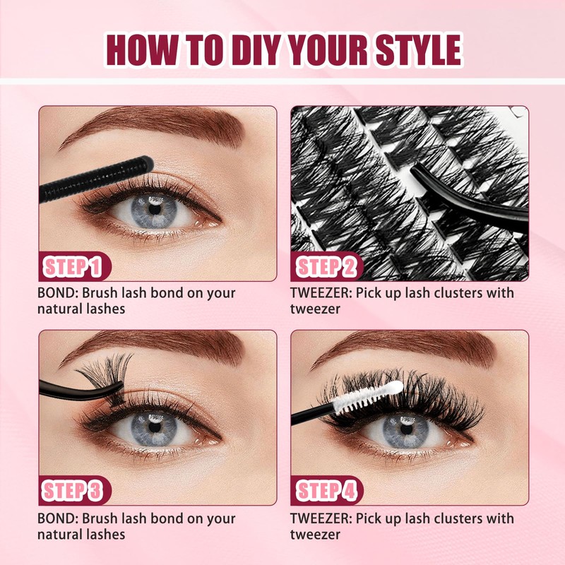 - DIY eyelash extension kit: buy DIY eyelash kit you will receive: 1 tray 280 pieces mixed length cluster eyelashes, 1 eyelash glue and seal (2 in 1), 1 eyelash applicator tweezers. This cluster eyelash extension kit will meet all your needs for DIY eyelashes at home, perfect for beginners and eyelash lovers