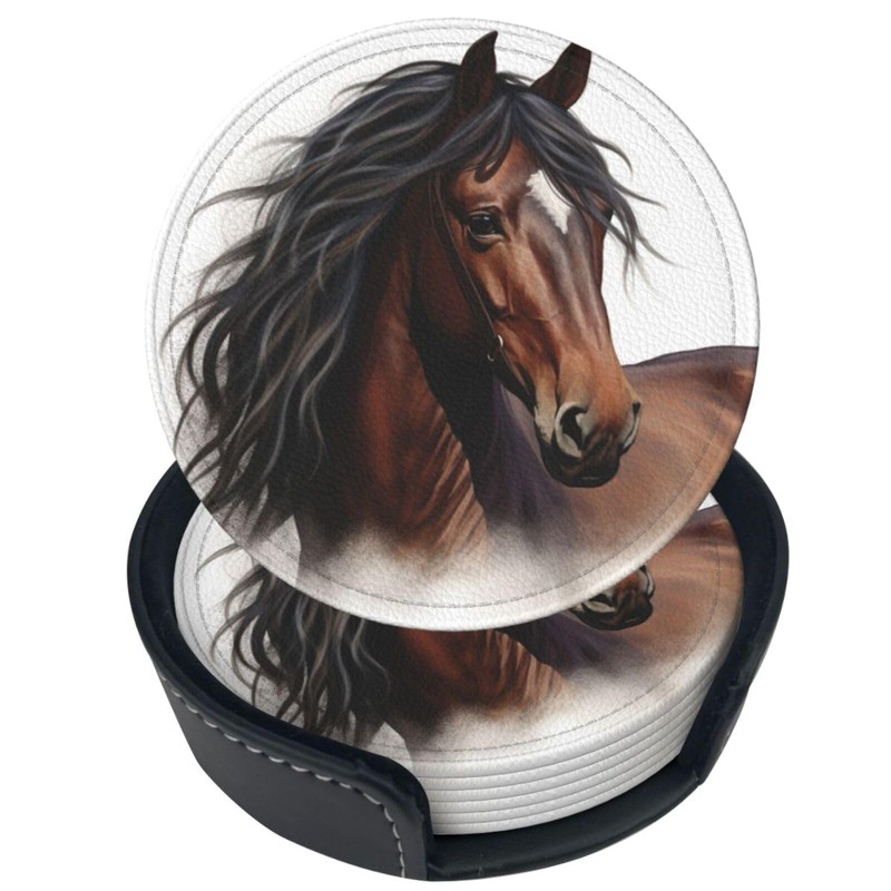 Famame 6 Pcs Handsome Brown Horse Leather Coasters for Drinks with Holder Coaster Sets Drink Table Cup Coasters for Living Room Kitchen Coffee Decor