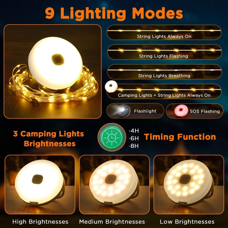- 【9 Light Modes】This camping fairy lights have 9 modes to choose from, including string light constant, string light flashing, string light breathing, camping light and string light combination lighting, the camping lamp also has three brightness adjustments, and you can turn on the torch mode and SOS blinking red mode when you are exploring outdoors. Meet the needs of any mood or occasion.