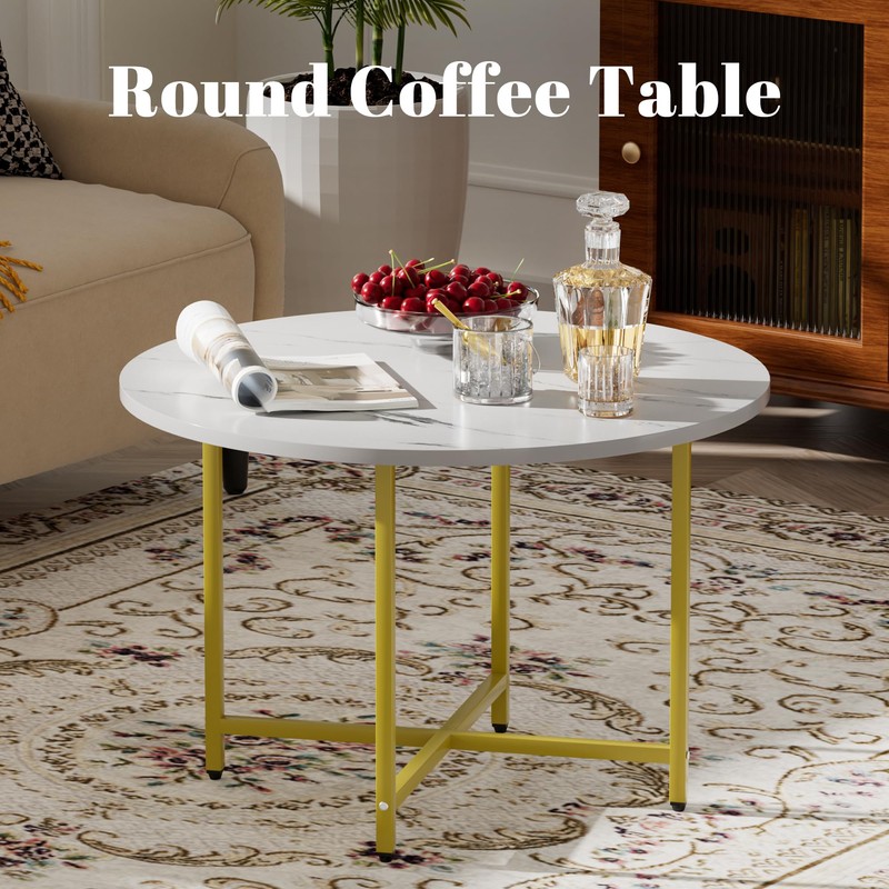 FAMIDGE Round Coffee Table, Small Coffee Tables for Living Room, Wood Coffee Table with Metal Frame, Floor Table Desk for Sitting on The Floor, Home, Office, Farmhouse, White & Gold (23.6"D x 17.7"H)
