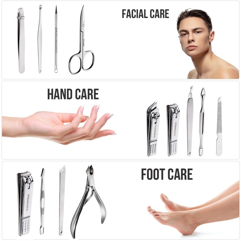 - Stainless Steel Complete Manicure Set & Nail Kits- FAMILIFE stainless steel manicure set men and women manicure set is made with High Quality Stainless Steel. This is a nail clippers for men or nail care kit for women. Dedicated mens grooming kit and inrown toenail tool. Either male manicure set or mens nail care kit. This nail clipper kit and grooming kit for men is a nail clipping kit great gift for your family and friends, or as leather gifts for men or women.