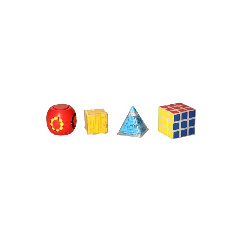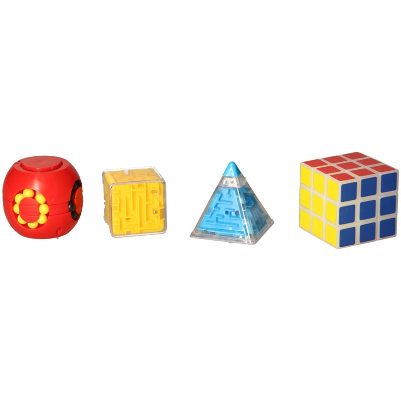 - COMPLETE SET: 4-in-1 brain teaser puzzle collection featuring a rotating bead barrel, ball maze, pyramid maze, and cube puzzle for endless entertainment
