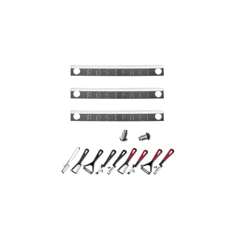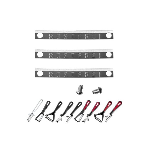- Set of 3 replacement blades and 2 screws for different peelers suitable for peelers with article numbers: 1061/2801/2802/2803/2804/2901/2903/2907/2909|