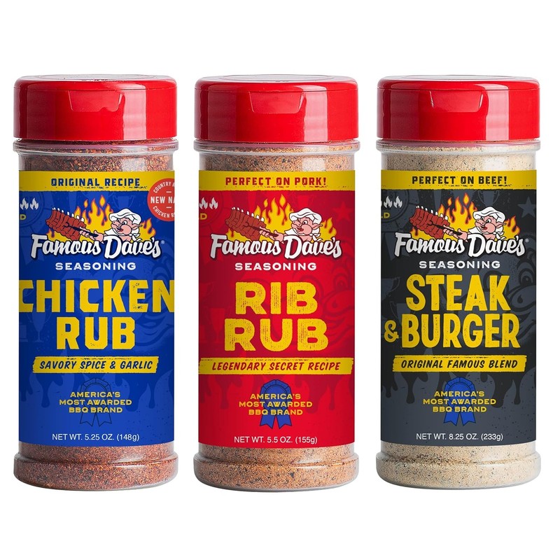 Get ready for grilling season with this great selection of Famous Dave's seasonings - Steak Burger, Rib Rub and Country Roast Chicken.