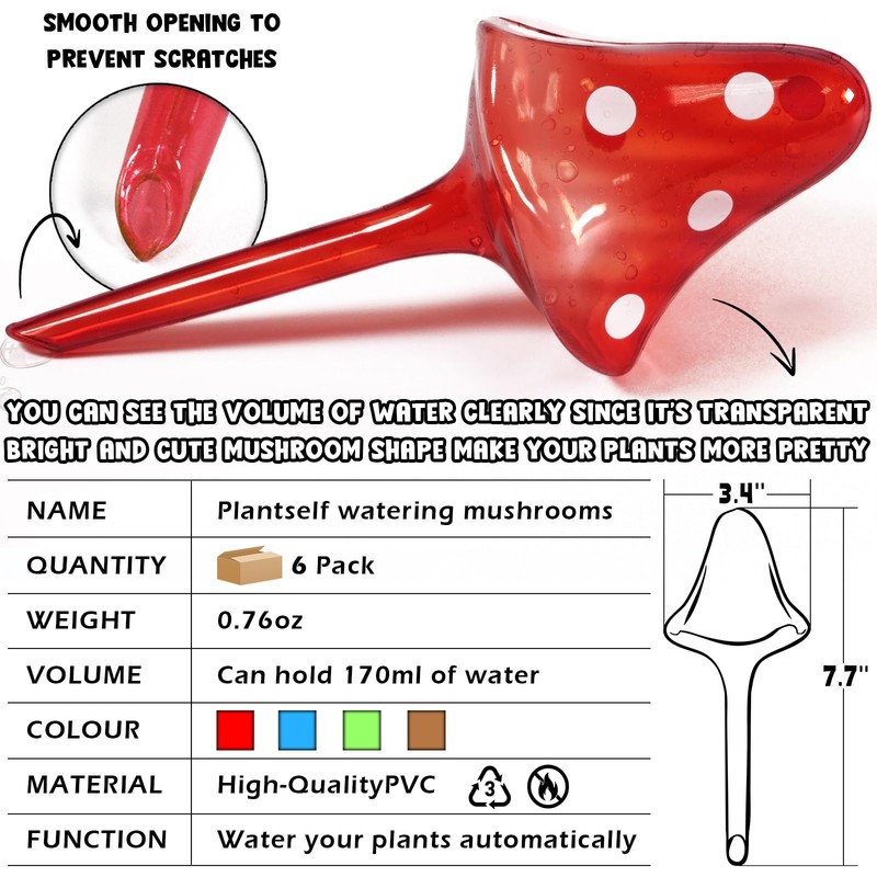 - 💌WATER GLOBES FOR INDOOR OUTDOOR PLANTS:The mushrooms are made of high quality PVC material,which is durable and long-lasting. Suits in house, backyard,office and balcony,where you can put your potted plants.To prevent warping and damage,please do not place it near super high temperatures and put corrosive chemicals into it. Please contact us if you have any questions.
