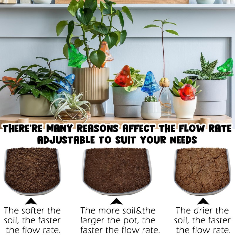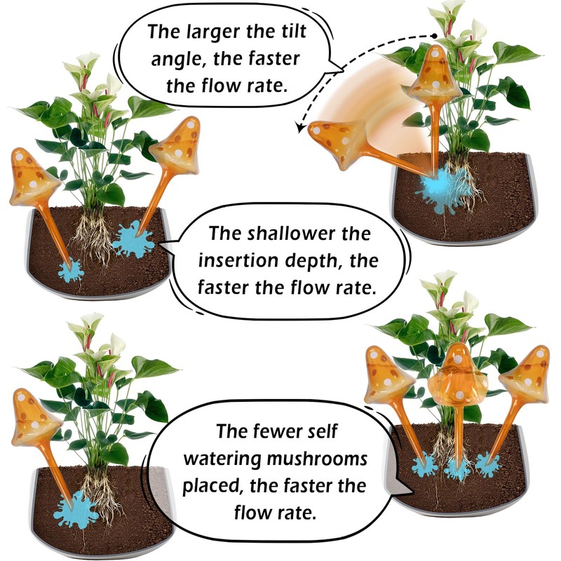 - 🌻PLANT WATERING SPIKES WHILE AWAY:No more worries about your plants when you're on vacation,traveling,business trip,any scenario where you need to leave the house. You can adjust the number of mushrooms placed,the angle of tilt,etc depending on how long you are away from home. Suitable for different plants. Like pot plants,hanging plant,bonsa,any outdoor&indoor plants.