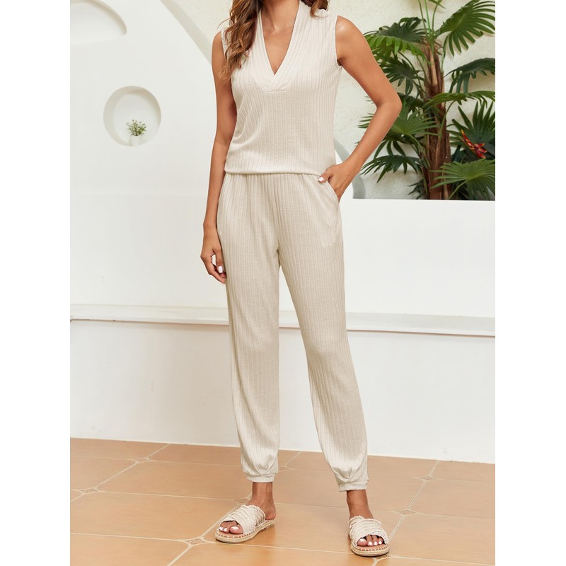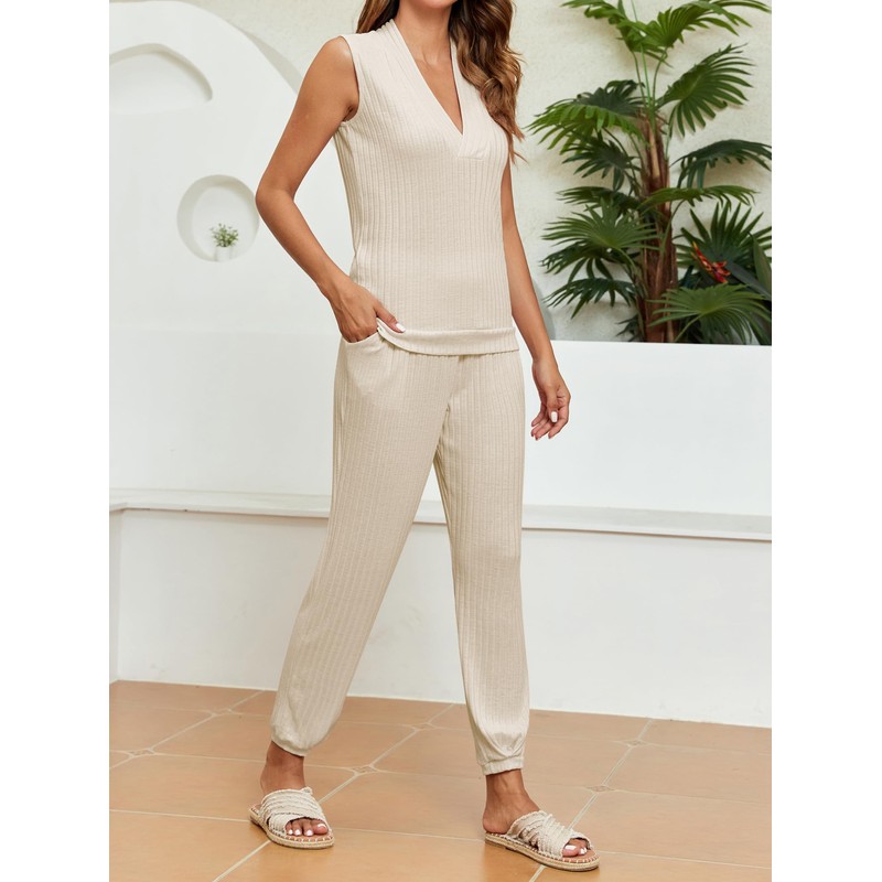 Famulily Womens Pajamas Set for Summer Knitted Casual Sleepwear Sets Sleeveless V Neck Shirts Jogger Pants Beige L
