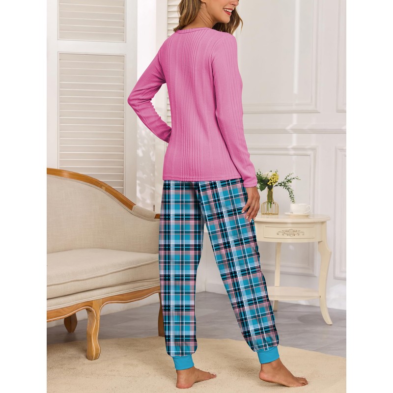 Famulily Womens Plaid Home Clothing Set 2 Piece Jogger Pjs Casual Ribbed Pullover Tops and Lounge Pants with Pockets Hot Pink XL
