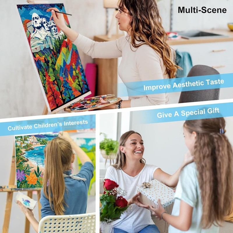 - Quality pigments and canvases: the pigments in the painting set are non-toxic, safe and high-quality acrylic paints. They are green and environmentally friendly pigments with high brightness, bright colours, high concentration and no water. The canvases we offer are printed in two colours to facilitate digital recognition and protect eyes. Professional oil paintings have a clear texture and are easier to color.