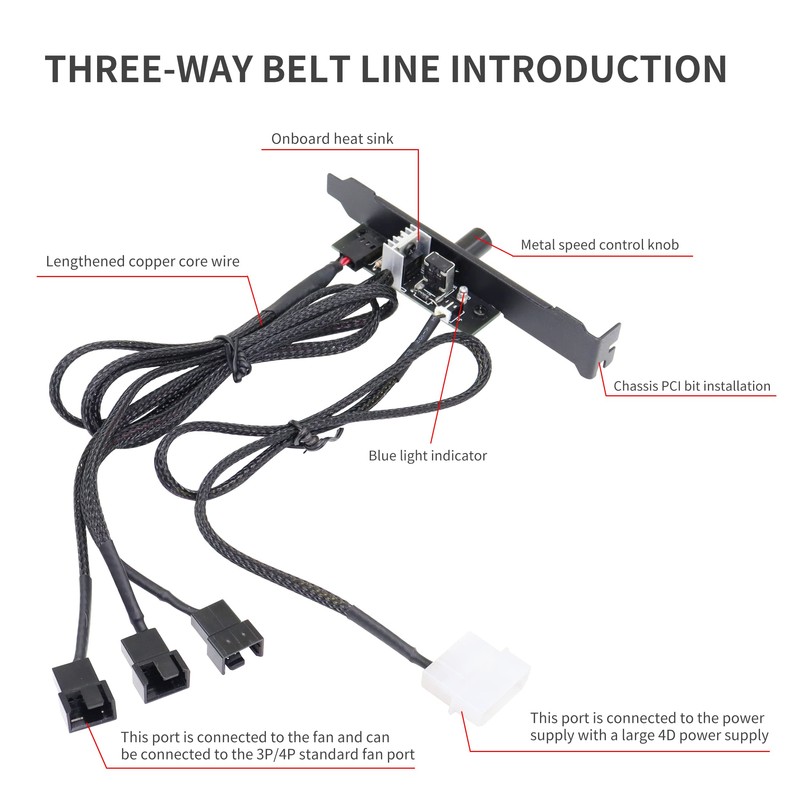 - Easy to install: PC 3-channel fan hub. The Governoris installed in the PCI position of the case, which can be more convenient for your adjustment, use and installation.