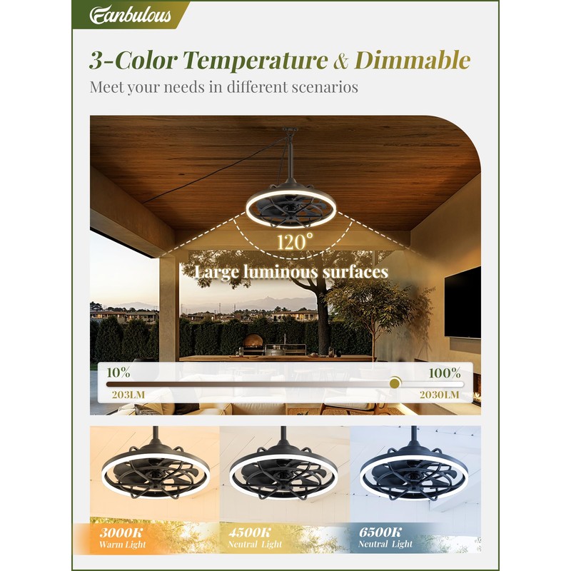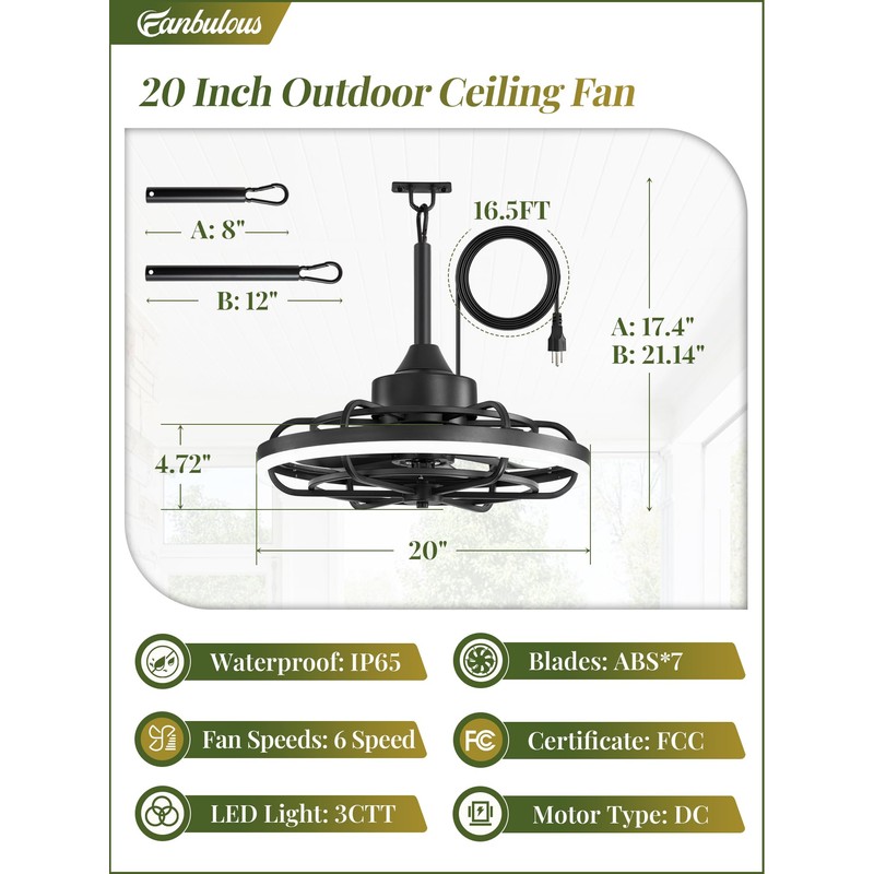 Fanbulous Outdoor Ceiling Fans with Light for Patios, 20" Weatherproof Plug in Ceiling Fan, Gazebo Fan Remote&APP Control, 3CCT Dimmable,Caged Ceiling Fan with Hanging Hook for Porch, Pergola,Canopy