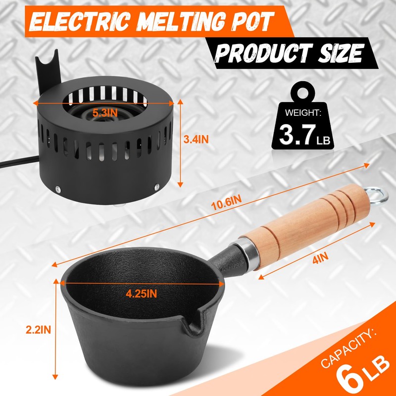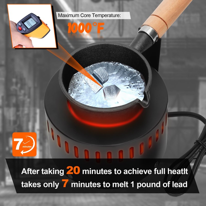 - Efficient Melting: Designed for efficiency,The lead melting pot effortlessly melts 15 pounds of lead ingots in just 30 minutes,averaging 7 pounds melted per minute,saving time and boosting productivity