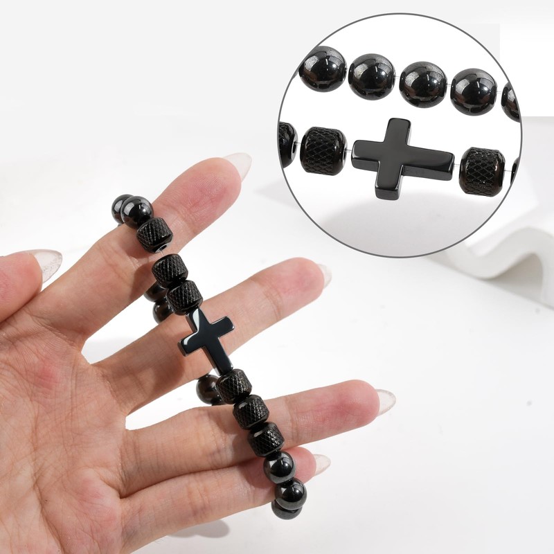 FANCIBAND Geschenk Sohn Armband Herren Kreuz Stein Obsidian Schwarz Elastisch, Rosenkranz Armbänder Herren An Mein Sohn Geburtstag Geschenke Weihnachten Erstkommunion Geschenk Abschluss zurück zur