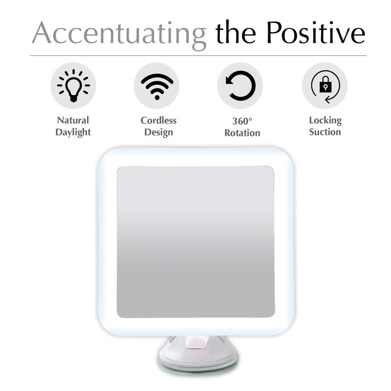 - CORDLESS AND PORTABLE Compact, battery operated, square design glass mirror; when folded, takes up fewer than 1/2 square foot of space. Comes with travel pouch!