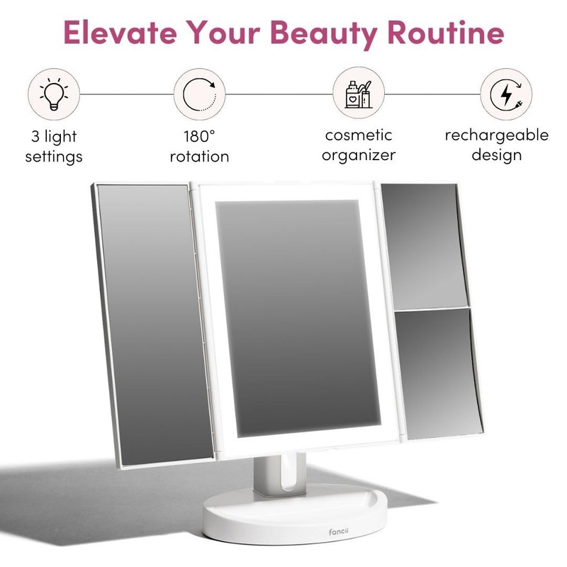Fancii LED Lighted Vanity Makeup Mirror, Rechargeable Trifold Mirror with 5X & 10x Magnifications - 68 Dimmable Natural Lights, Touch Screen, Best Adjustable Make Up Mirror with Cosmetic Stand