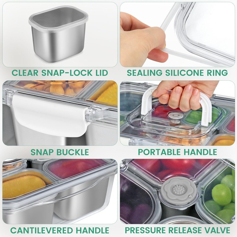 - ALL IN CONTAINERS: 8-compartment stainless steel snackle box, whether dry or wet, solid or sauce. Each compartment designed with clear snap - lock lid so that makes snacks and dired fruits better categorized without mixing the flavors.