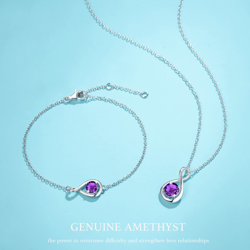 - ❤Amethyst Jewelry❤ This infinity birthstone necklace is designed with infinity symbols and inlaid with a purple round-shape stunning and shining created amethyst birthstone. Amethyst is the legendary birthstone for February, the stone of the sixth wedding anniversary and the lucky stone of Pisces, symbolizing honesty, wisdom, spirituality, calmness, peace and tranquility.